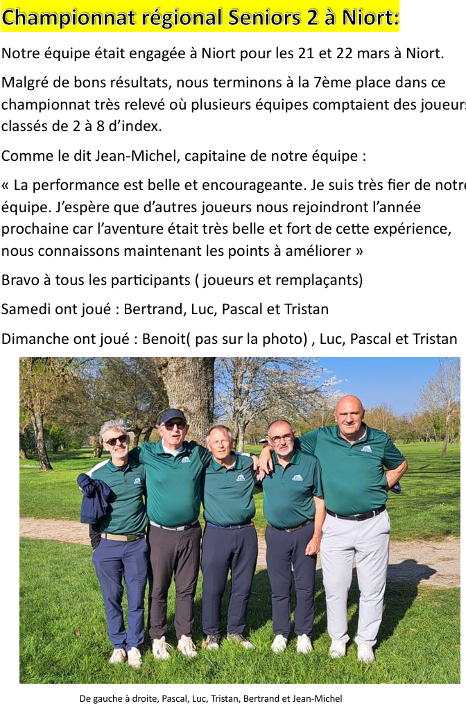 – Notre Championnat Match-Play du club débutera le 6 avril pour se terminer fin septembre.