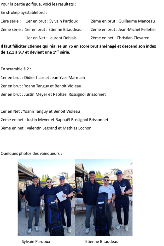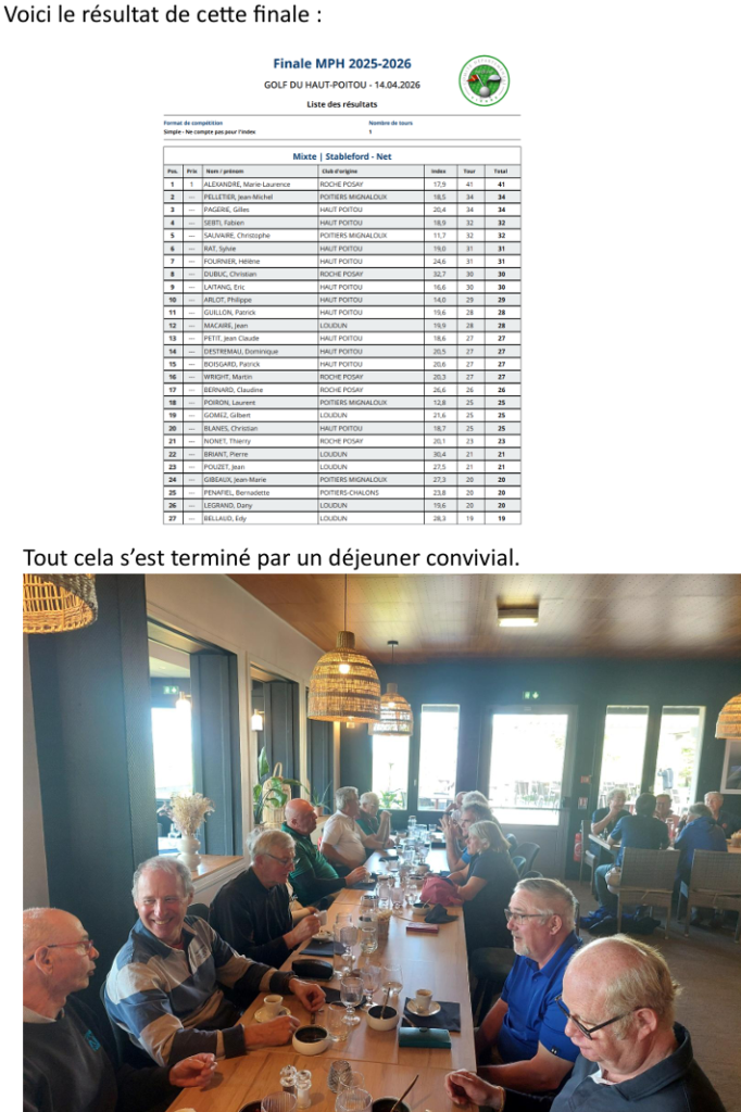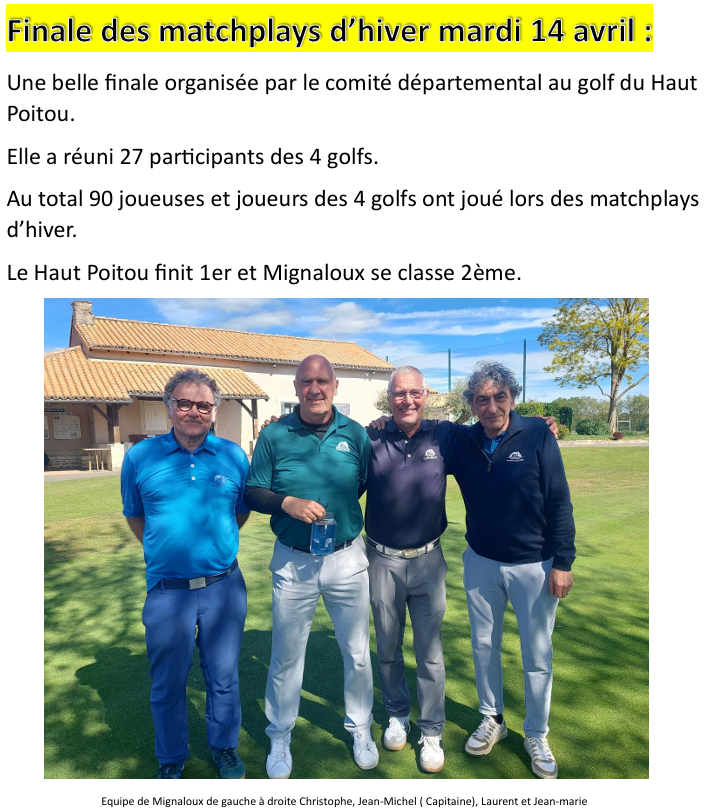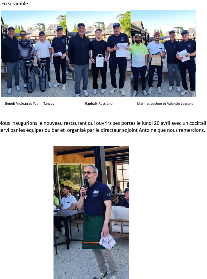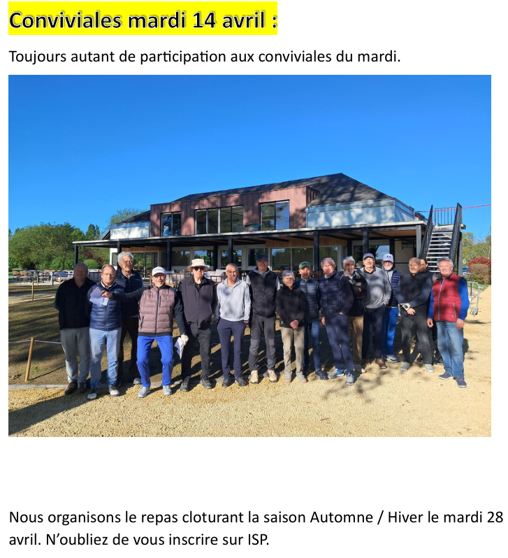 Mardi 28 avril : Finale des conviviales avec déjeuner en commun( inscription sur https://isp.golf )Jeudi 1er mai : Coupe du Comité Départemental à la Roche Posay. Une équipe de Mignaloux composée de 4 Dames, 4 Messieurs et 4 seniors sera présente pour représenter le club.